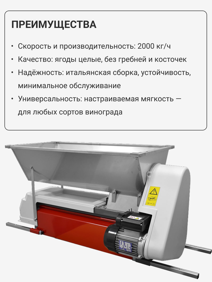 - Регулировка по мягкости дробления, что позволяет учитывать нюансы получения мезги из винограда разных сортов и размеров.