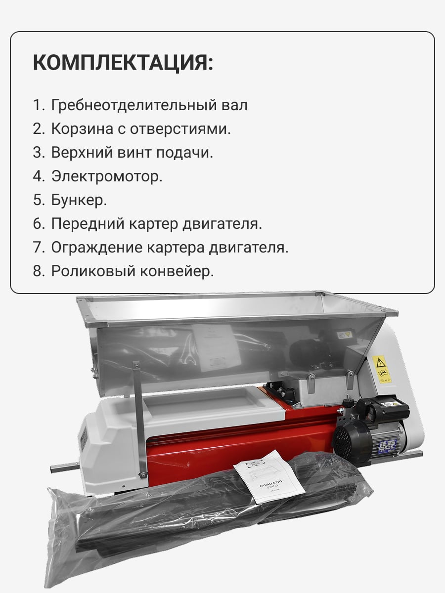 Виноград скользит по стенкам бункера (5) на пару роликов (8), где производится его дробление. После того, как он раздроблен, подается к гребнеотделительному валу (1), где отделяются стебли. Далее виноград поступает в корзину с отверстиями (2) и попадает в предварительно подставленную под машину емкость.